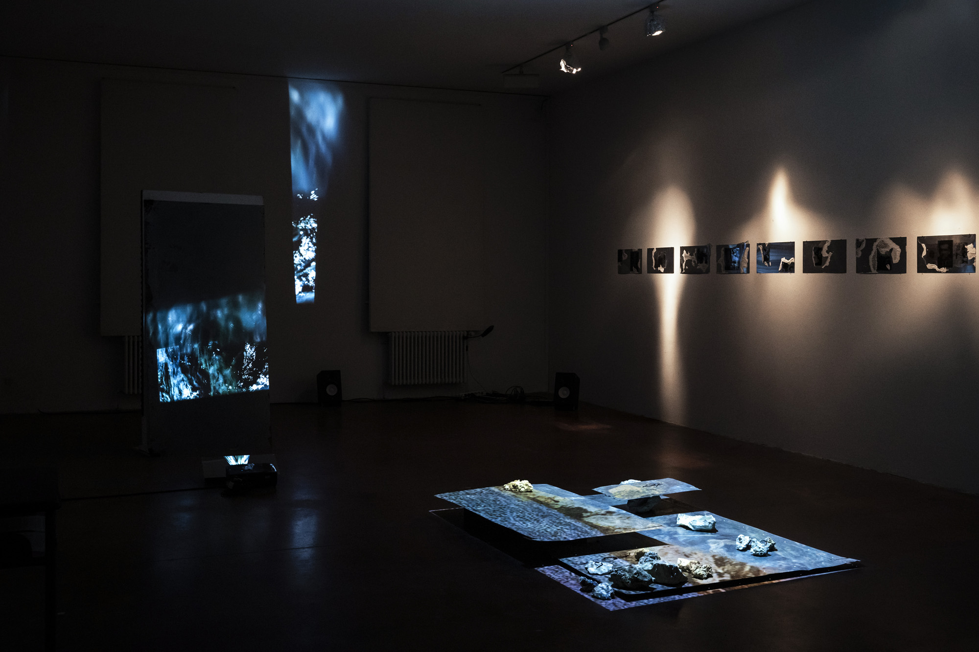 Die Künstlerin begann nach den Einzelschicksalen der Lagerinsassen zu recherchieren, über die Zwangsarbeit, zu denen sie gezwungen wurden, und über die Materialien, die sie zum Bauen verwendeten, ebenso wie über die Materialien, die sie umgaben. Die im Ausstellungsraum auf dem Boden schwebende, rostig, ockerfarbene, scharfkantige Oberfläche wird zur Projektionsfläche von kürzlich aufgenommenen, analogen 35-mm Filmen der Landschaft von Slana. Wie aus der Perspektive von Satellitenfotografie anmutend, gleiten die frontalen, vom Boot aus fotografierten Aufnahmen im Wechsel über die flache und felsige Formation. Aus ihrer Statik entzerrt, überlagern sich die Elemente. Wasser überzieht die von der Insel stammenden Gesteine. Auf der Suche nach materiellen Spuren der Vergangenheit, sind es die steinernen Zeugen, die von dem Verschwiegenen erzählen.