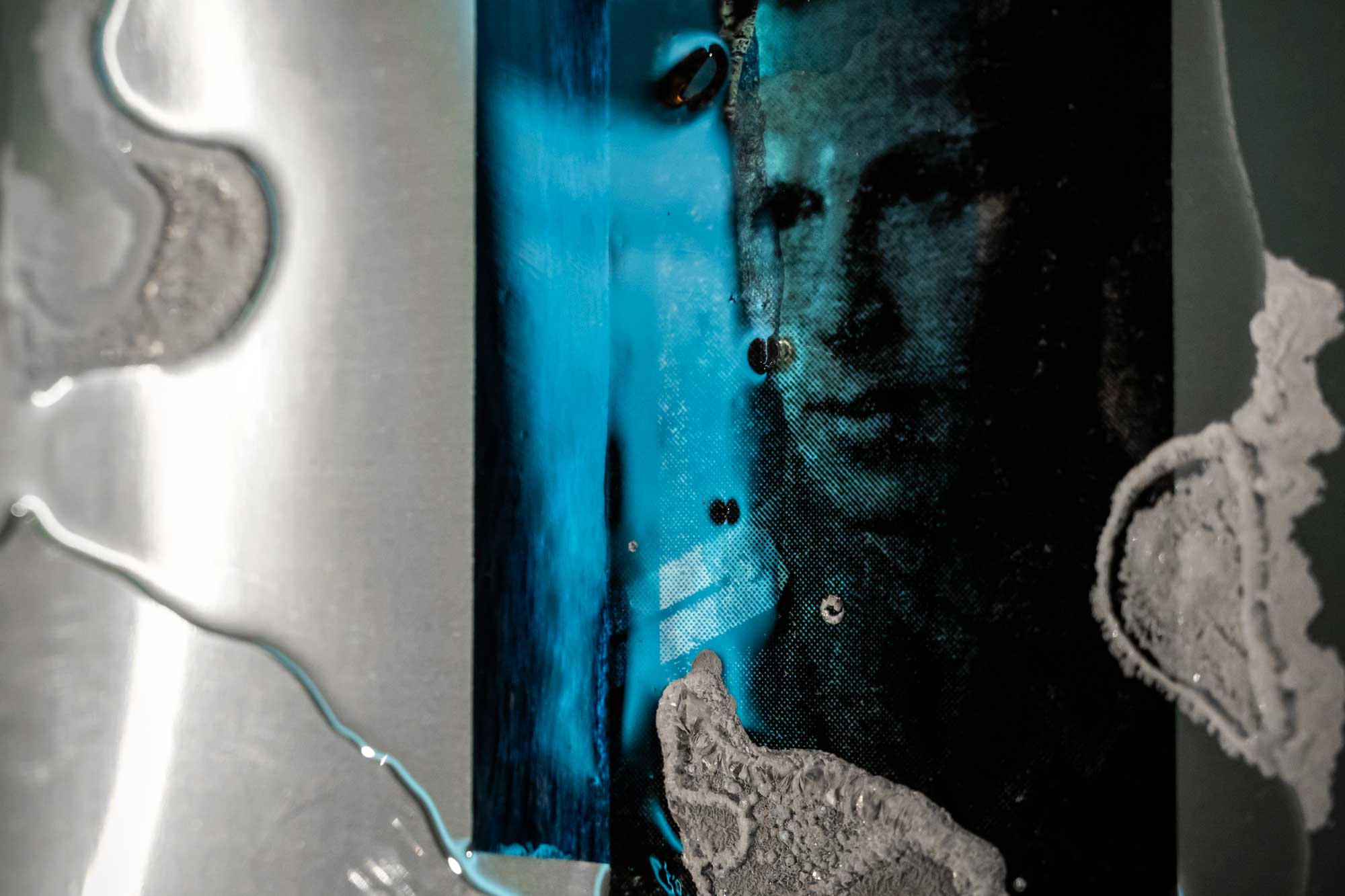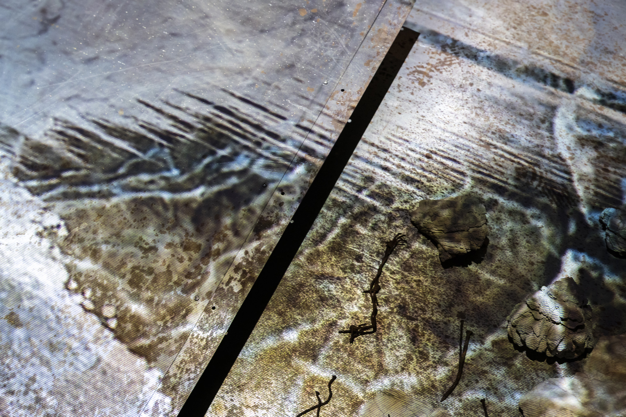 In voller Schärfe dagegen erzählen die an der Wand aneinandergereihten Aluplatten. Regelrechte Überlagerungen, geradezu ein Aufschichten von Archivmaterial, gegenwärtigen Landschaftsbildern und Artefakten von archäologischen Ausgrabungen verdichten sich. Dabei bindet das Epoxy die Schichten in eine Einheit. Durch den Entzug von Sauerstoff sind die Zeitebenen untrennbar konserviert. Durch die Verdunstung von Wasser lassen die Salzablagerungen Spuren sichtbar, auch dies ist eine Form der Konservierung.