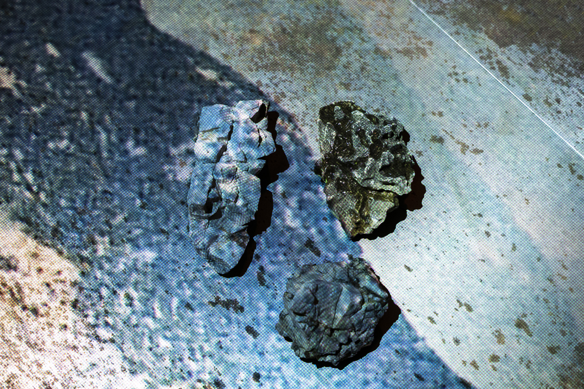 Opposite, the aluminium plates arranged along the wall narrate with full sharpness. True overlays, almost a layering of archival material, contemporary landscape images, and artifacts from archaeological excavations, condense. The epoxy binds the layers into a single unit. Through oxygen deprivation, the temporal levels are inseparably preserved. Through the evaporation of water, salt deposits reveal traces, which is another form of preservation.